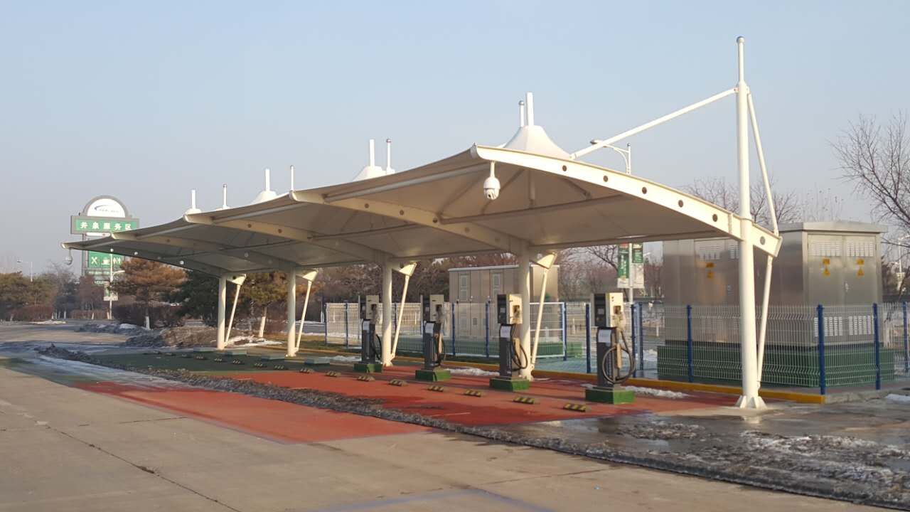 膜结构车棚修建的支撑通常为钢布局,国内关于钢布局的维护多选用涂防火涂料。国外相似修建大多是不涂防火涂料的。还有一种更为保险的办法就是在布局上作处置使膜面紧贴在钢索下面,火灾中烟气首要面临的是膜面,这样钢索下面又多了一个维护层而使钢架不受任何高温作用。