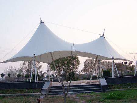 张拉膜是用高强度柔性薄膜材料经受其它材料的拉压作用而形成的稳定曲面,能承受一定外荷载的空间结构形式。其造型自由、轻巧、柔美,充满力量感,阻燃、制作简易、安装快捷、节能、易于、使用安全等优点,因而使它在世界各地受到广泛应用。